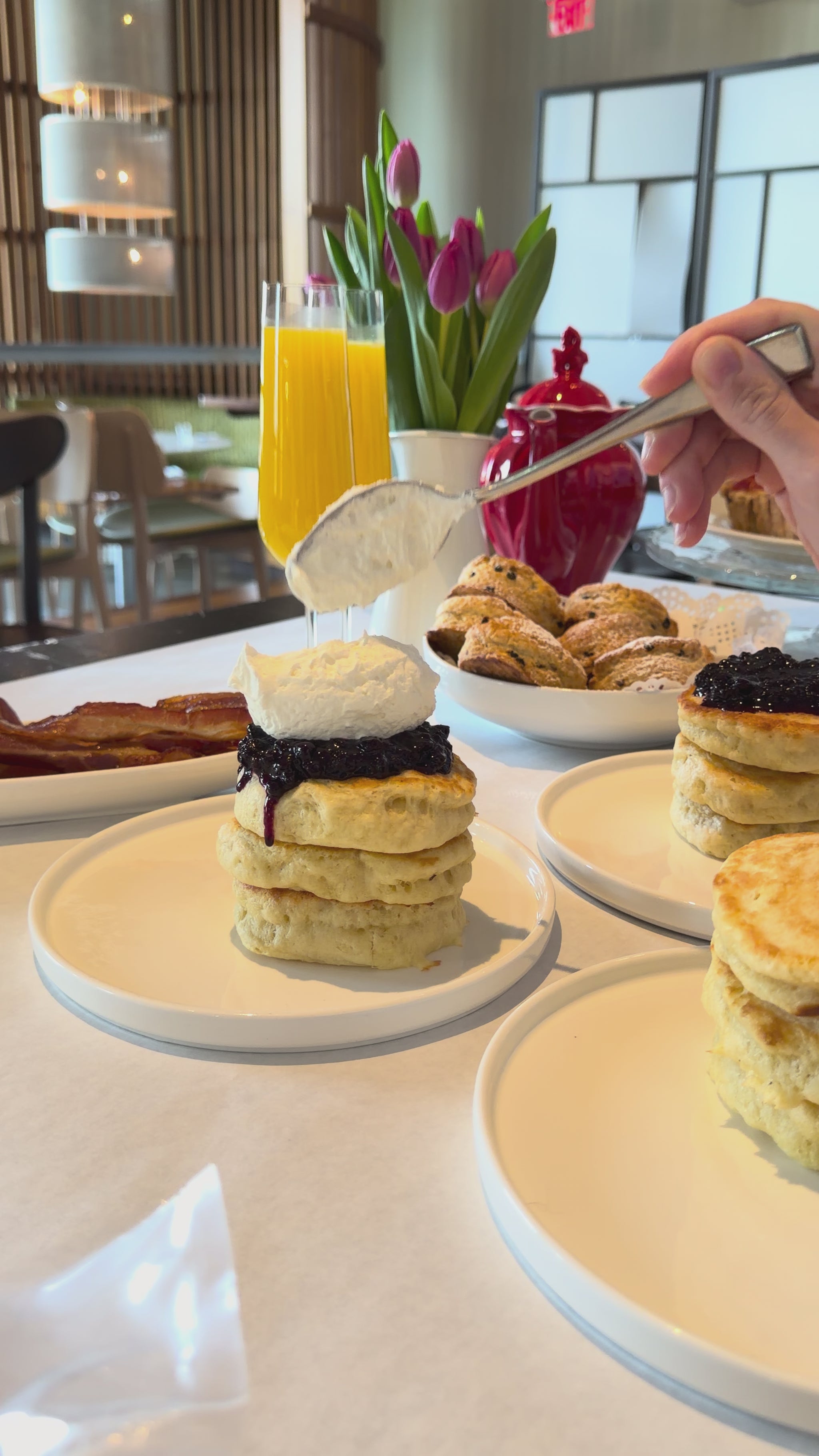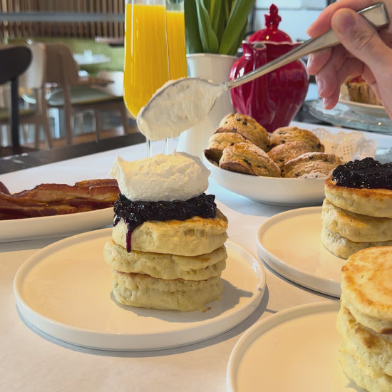 You will get at least 12 big fluffy pancakes (and you can do mini, too for more!), 6 scones with apple butter and 6 slices of delicious cheesy tart. Plus bacon. And OJ. And tea!